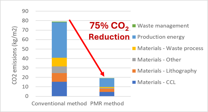 The combination of direct PI metalization with semi-additive process (SAP) greatly shortens the production process, which leads to much less energy usage, water consumption, wastewater and other harmful substances in addition to carbon dioxide emissions than the traditional subtractive process.