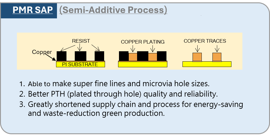 PMR’s semi-addition process (SAP) is a specialized FPC process that combines the advantages of additive process and subtractive process such as high resolution, small lateral etching, and stable line quality. Compared with the modified semi-additive process (mSAP) which takes the ultra-thin copper foil substrate (copper thickness usually 1~3μm) as the initial material, SAP starts with through-hole drilling and then direct metalization, forming an extremely thin conductive layer on PI films. Both mSAP and SAP can achieve much better line resolution than the traditional subtractive process. mSAP can easily meet 20/20μm line width/space, while SAP can even reach ultra fine-line below 10/10 μm.